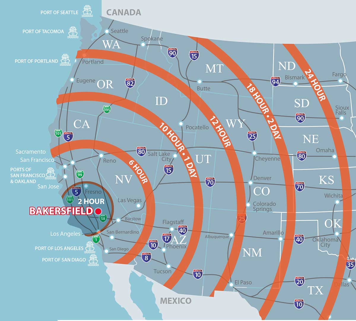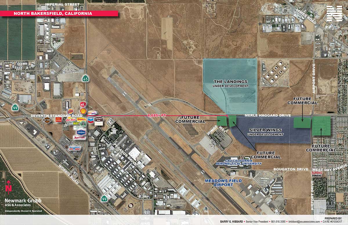 The City of Bakersfield is located in Kern County, approximately 2 hours north of Los Angeles and 4 hours south of San Francisco/Sacramento. Silver Wings Commerce Center is strategically located in north Bakersfield immediately adjacent to the new Bill Thomas Terminal at Meadows Field. North Bakersfield has seen rapid growth over the past decade and is home to many domestic and international corporations.